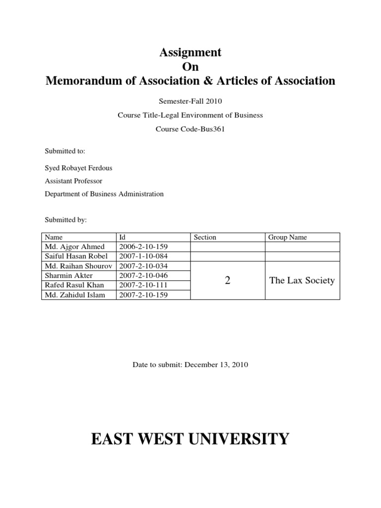 Articles of association - Legal Environment of Business ... from image.slidesharecdn.com These questions are answered in this article. Memorandum of association (moa) and article of association (aoa) are important documents that are filed during the process of incorporation of any memorandum of association (moa) is the main, compulsory document required for the incorporation of the company. If you need help to retrieve your memorandum or articles of association, contact our professional and reputable company formations team who will help you every step of the way. The articles of association is a governing document that outlines the purpose of the company, the rights and responsibilities of its members and directors, and the way in which the company must operate as a whole. These must be submitted at the time of application for. In simple words, the moa is the foundation on which the company is built. Articles of association of the company is a document which regulates the internal management of the company. The memorandum and article of association act as a charter to the companies through which the companies are regulated in india.
